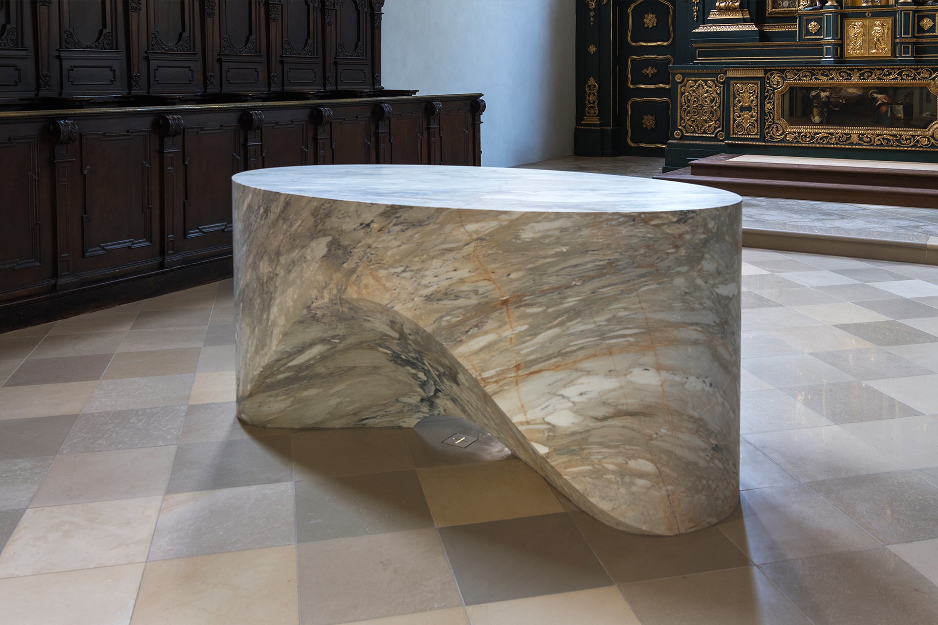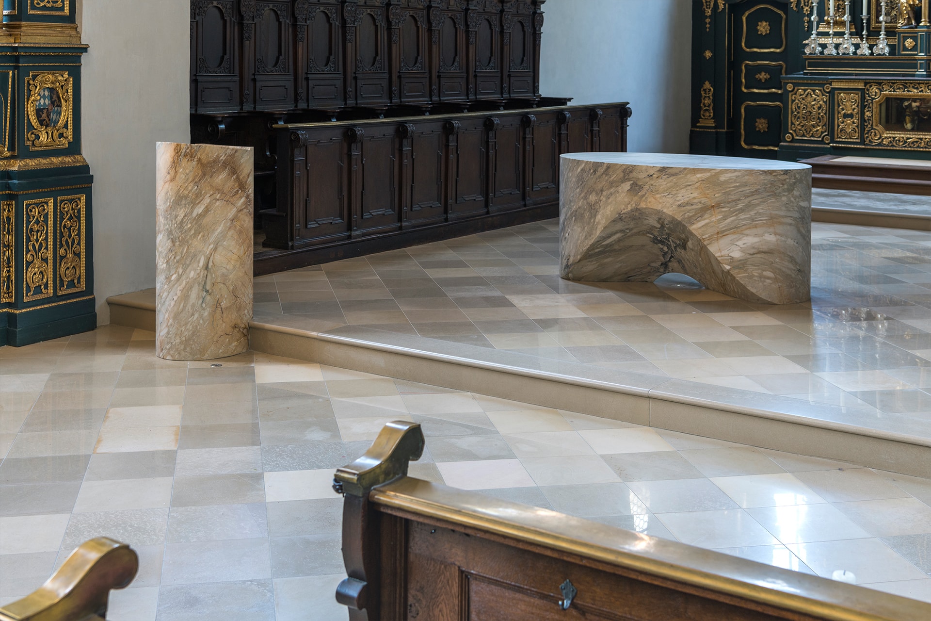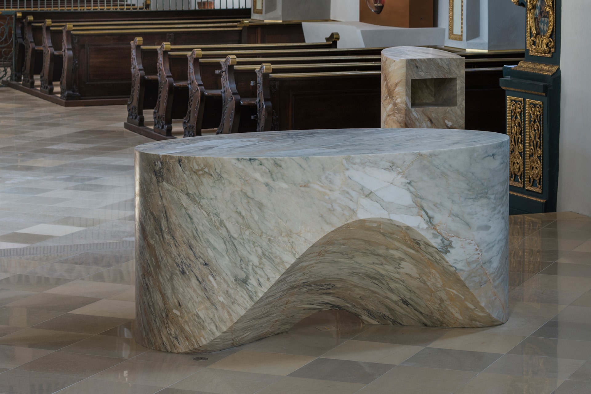 links: Ambo aus Calacatta van Gogh, 55 x 55 x 150 cm fein geschliffen rechts: Altar aus Calacatta van Gogh, 200 x 110 x 95 cm, fein geschliffen