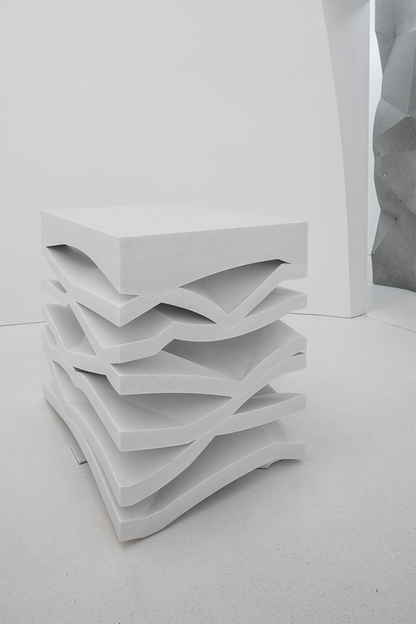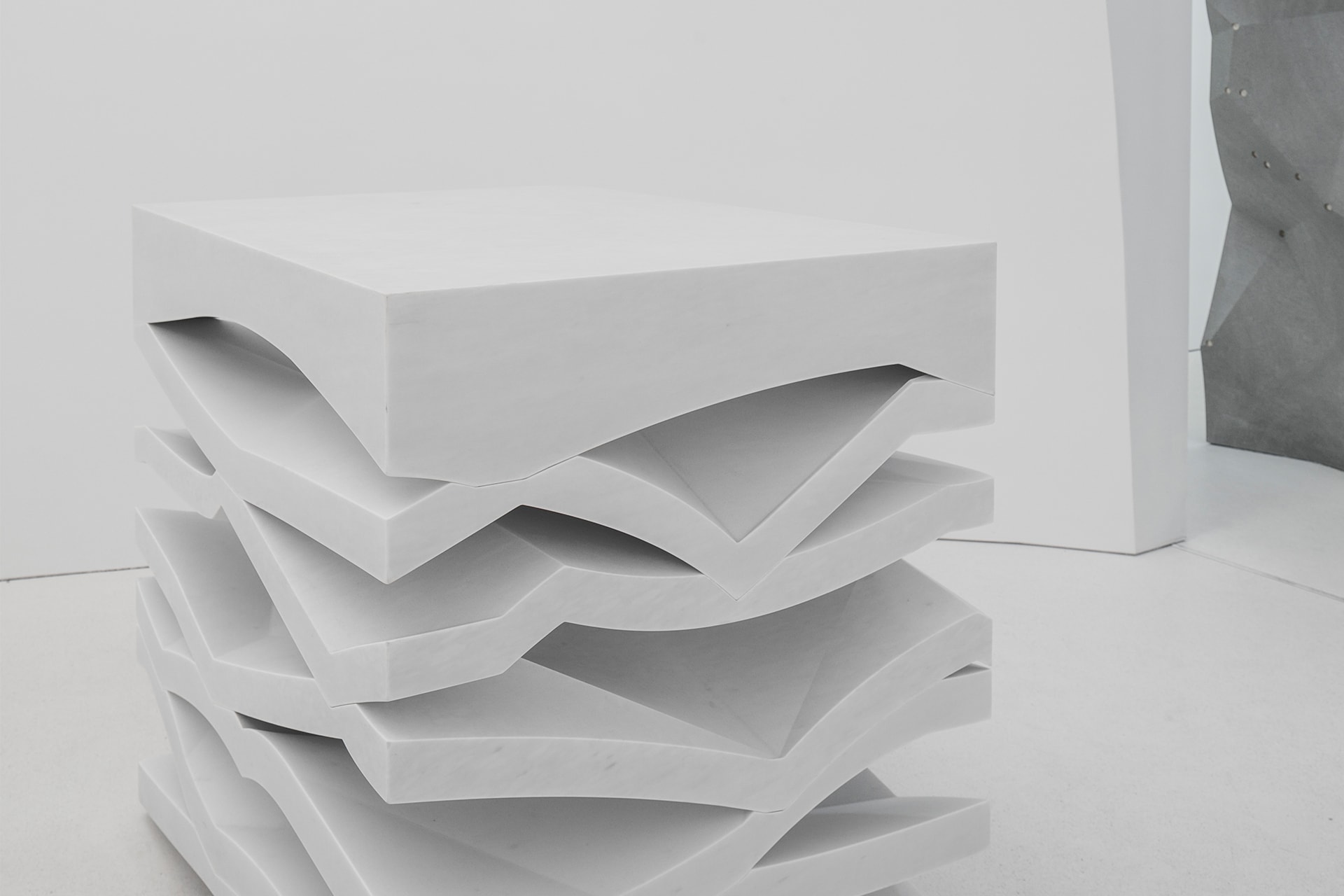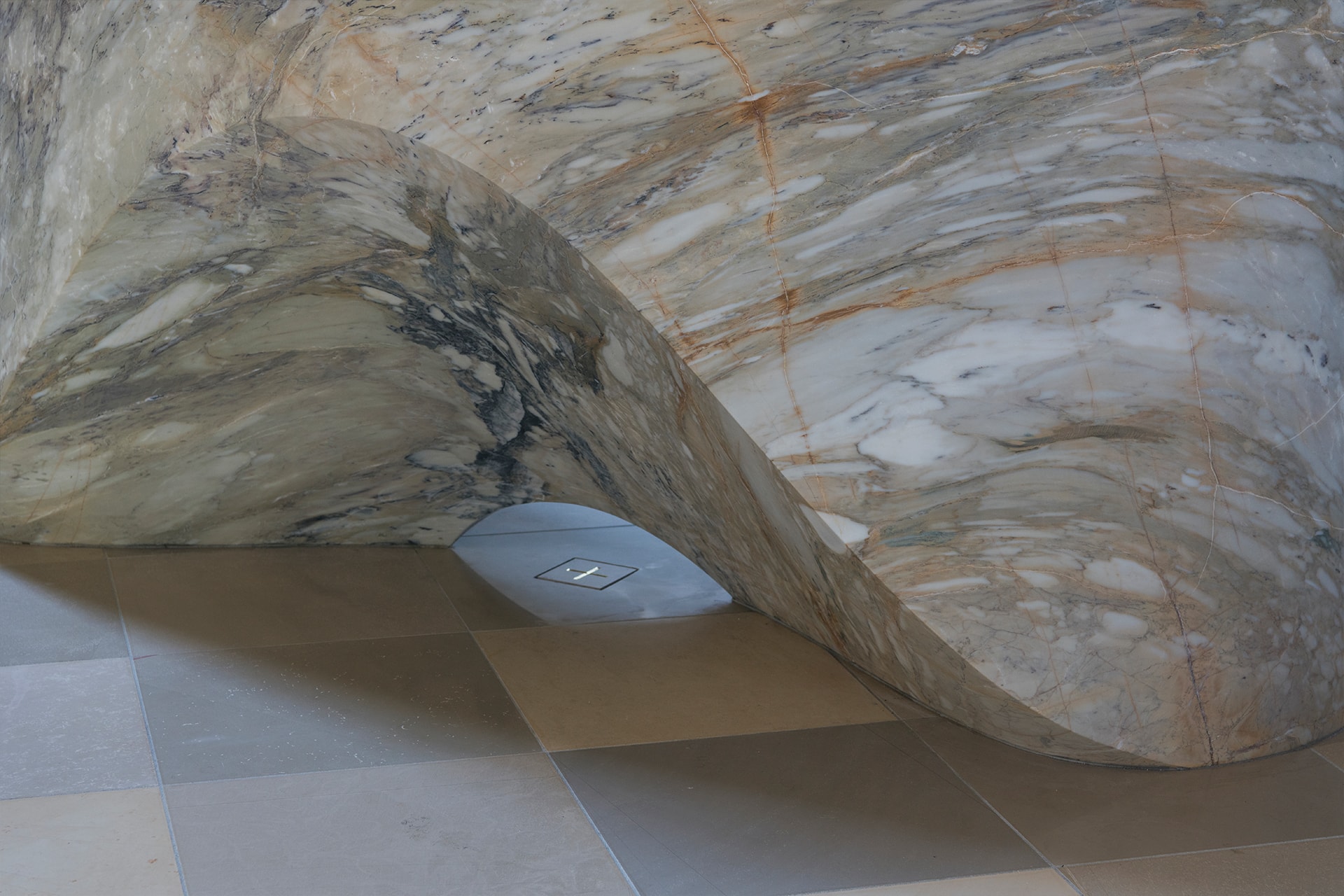 links: Ambo aus Calacatta van Gogh, 55 x 55 x 150 cm fein geschliffen rechts: Altar aus Calacatta van Gogh, 200 x 110 x 95 cm, fein geschliffen