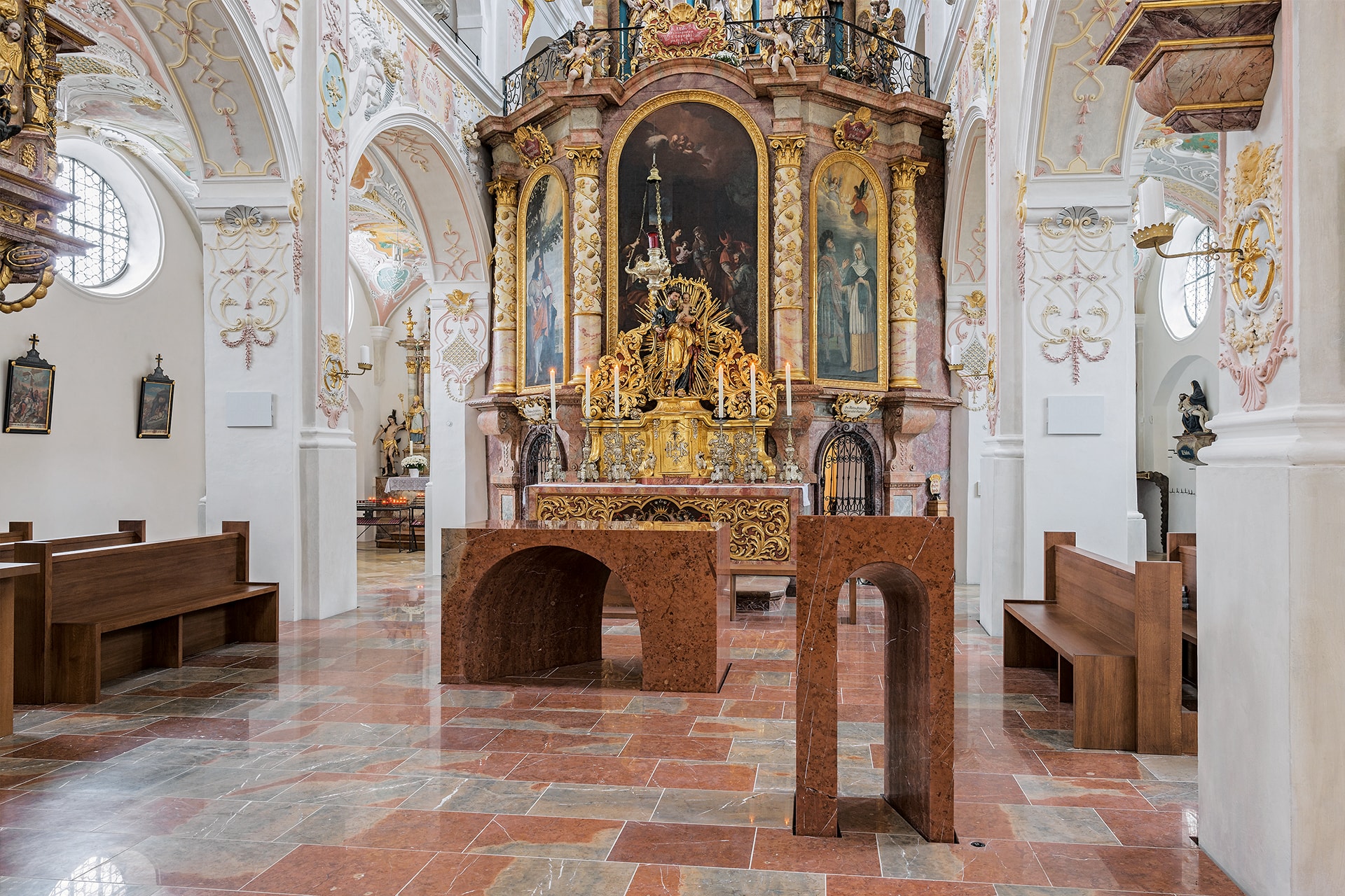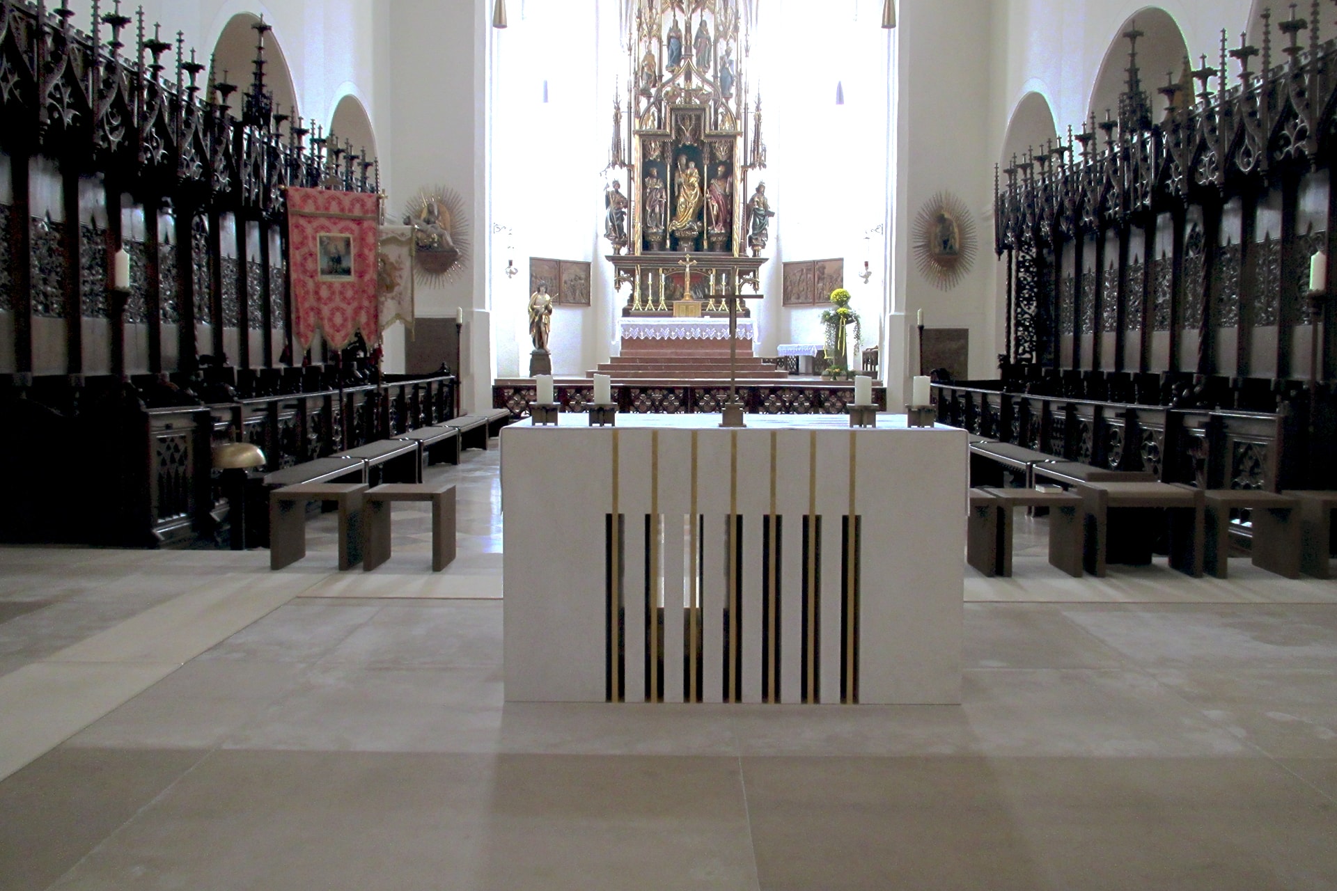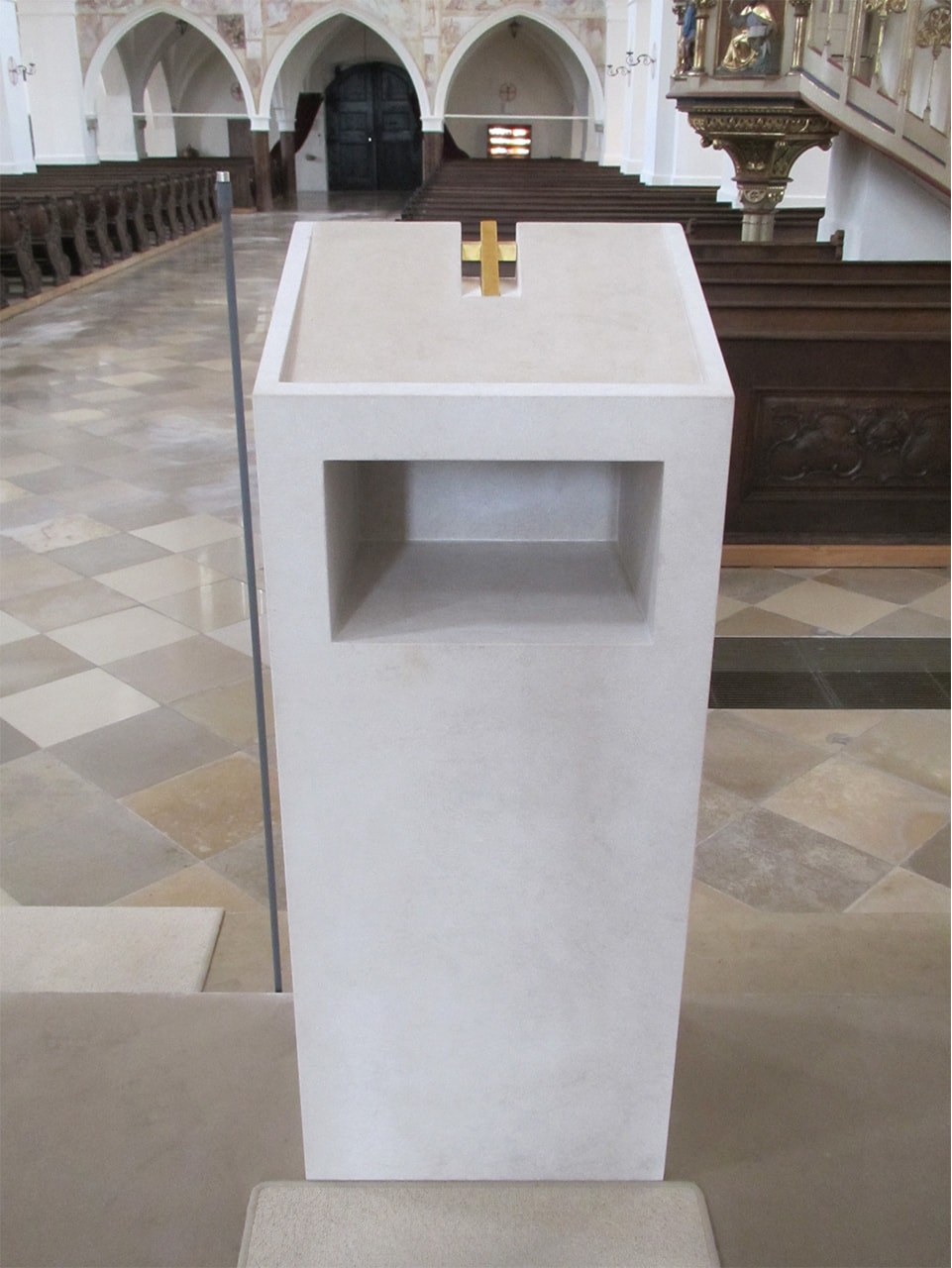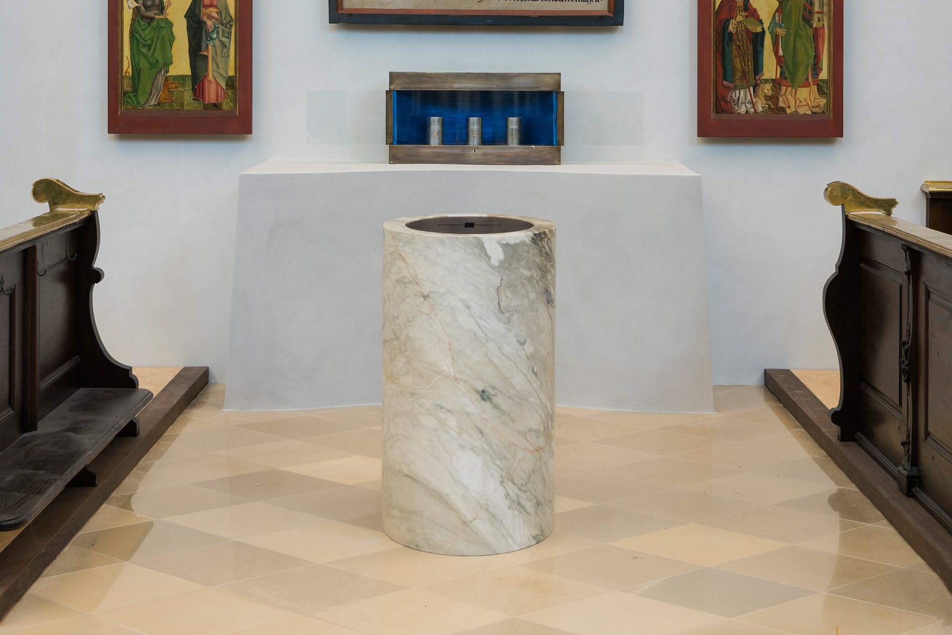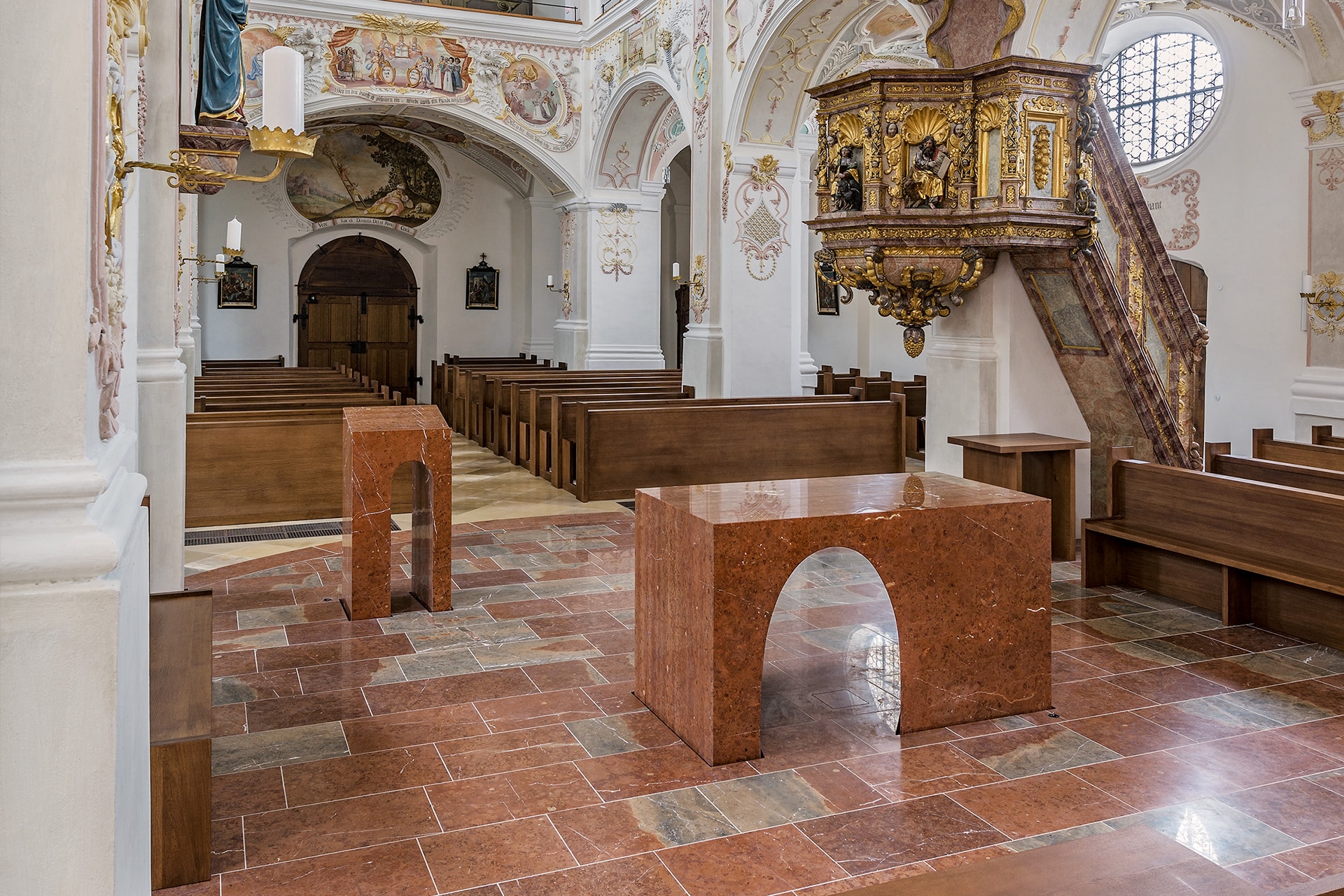Altarplatte aus Lasa-Marmor, 100 x 100 x 35 cm, fein gefräst Altarsockel aus Beton mit Zuschlag aus Lasa-Marmor, 100 x 100 x 60 cm, massiv aus einem Stück, gefräst